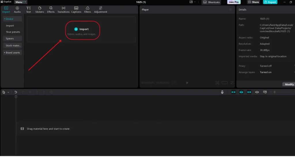 At first, visit the official CapCut site and install the application on your Windows PC or macOS. Once you install and open the program, you will see the “Create project” button on the main screen and you should click on it. Before you get started, you should save your stop-motion video clips onto your computer so that you can easily import them into the project.